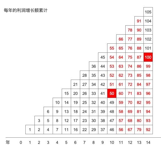 看上图,最下面一行是年,0表示今年,1表示明年,以此类推。明年的利润增长额是一个单位,后年是两个单位,每年的增长额都会多增长一个单位。